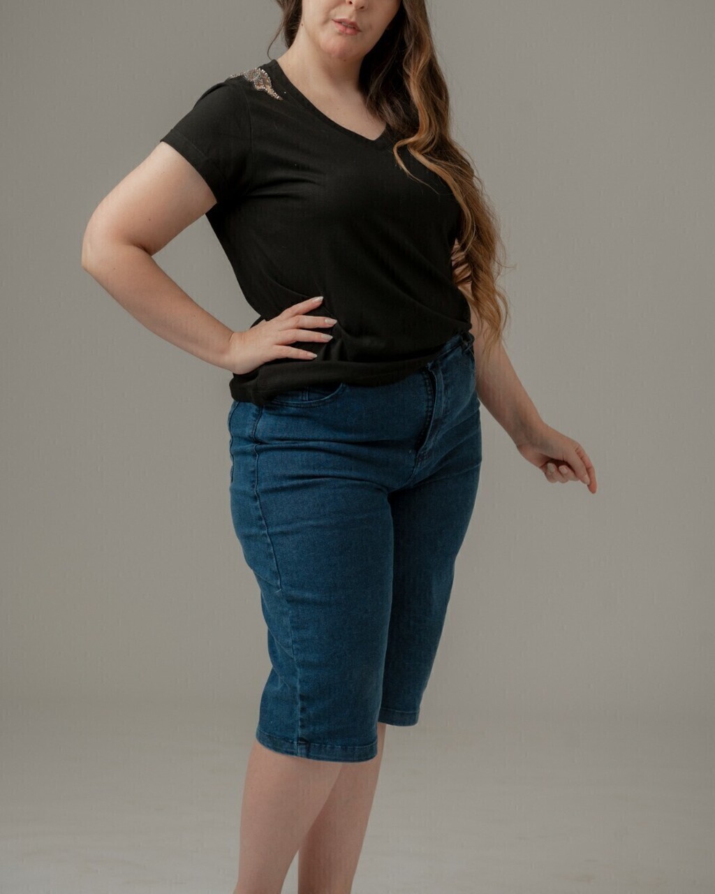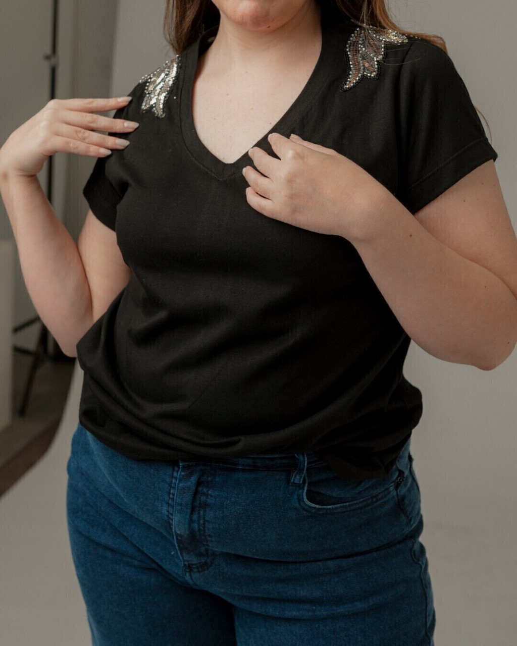 La Remera Flowers de la cápsula Matilda es una prenda diseñada para mujeres que buscan un estilo único y sofisticado. Con mangas cortas y cuello en V, esta remera se destaca por su charretera bordada con canutillos y strass, que le aporta un toque de elegancia y un brillo sutil pero impactante. Disponible en talles grandes, desde M hasta 5XL, para que todas puedan lucir esta tendencia con comodidad y actitud.